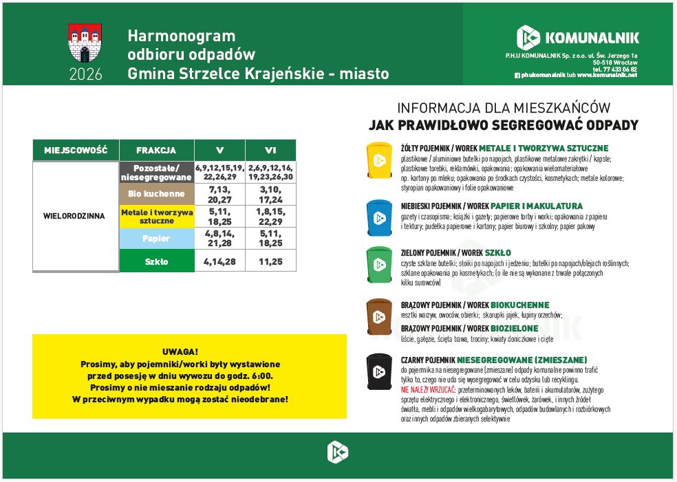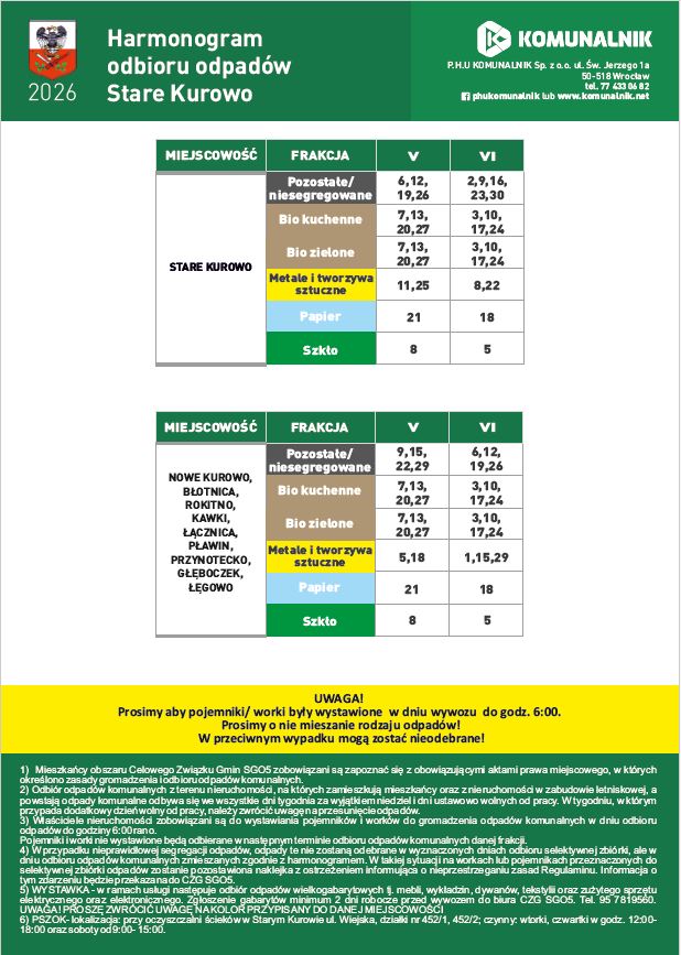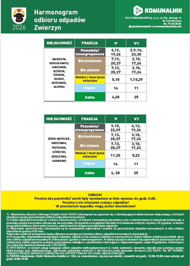 przedstawiamy harmonogram odbioru odpadów obowiązujący od lutego do kwietnia 2026 r.
